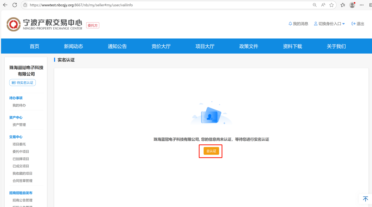 未实名的个人用户登录宁波产权交易中心官网,进入用户中心——“待实名认证”页面,点击【去实名认证】,会跳转到个人实名认证页。