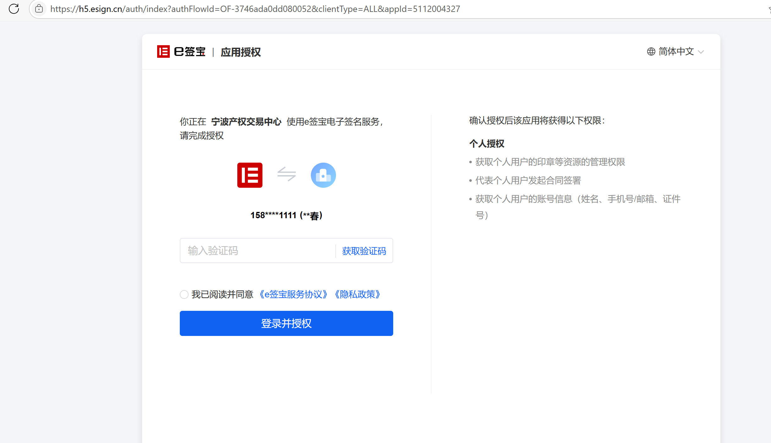 进入个人实名认证页后,需要进行应用授权,获取并输入验证码后,勾选阅读并同意,点击登录并授权提交。