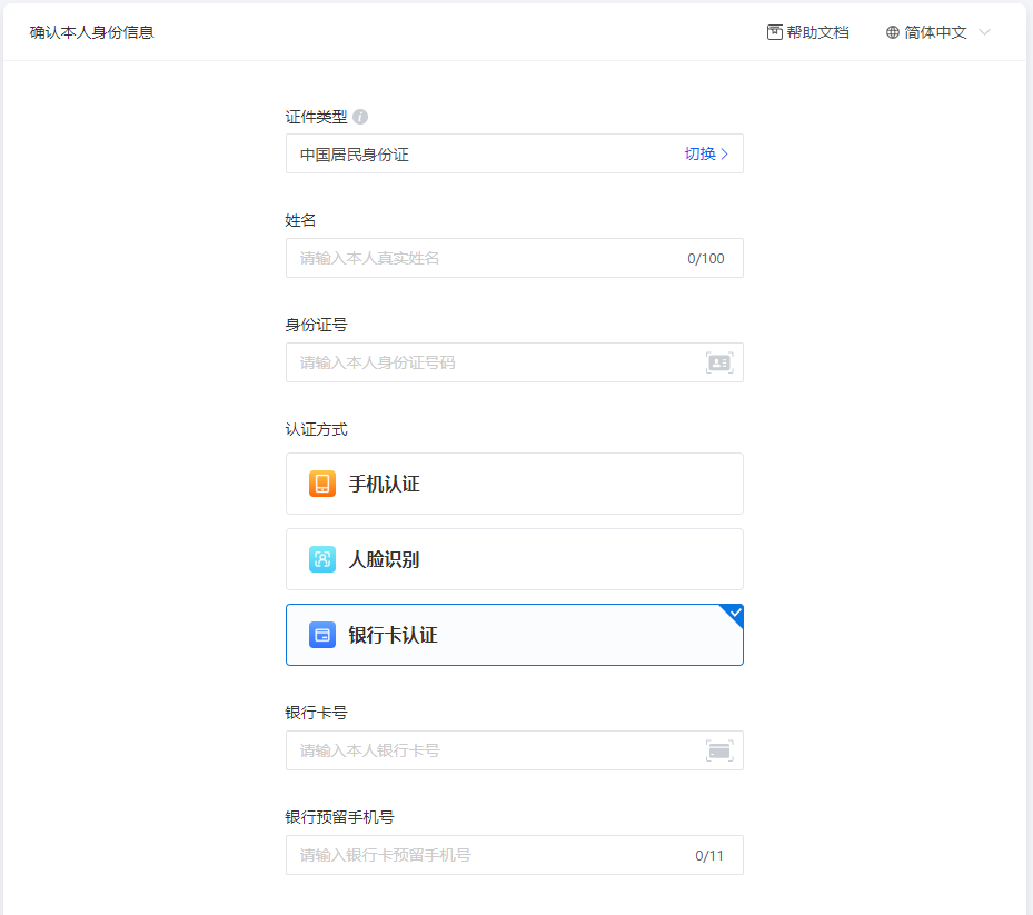 银行卡认证:需输入姓名、身份证号、银行卡号、手机号四要素信息。