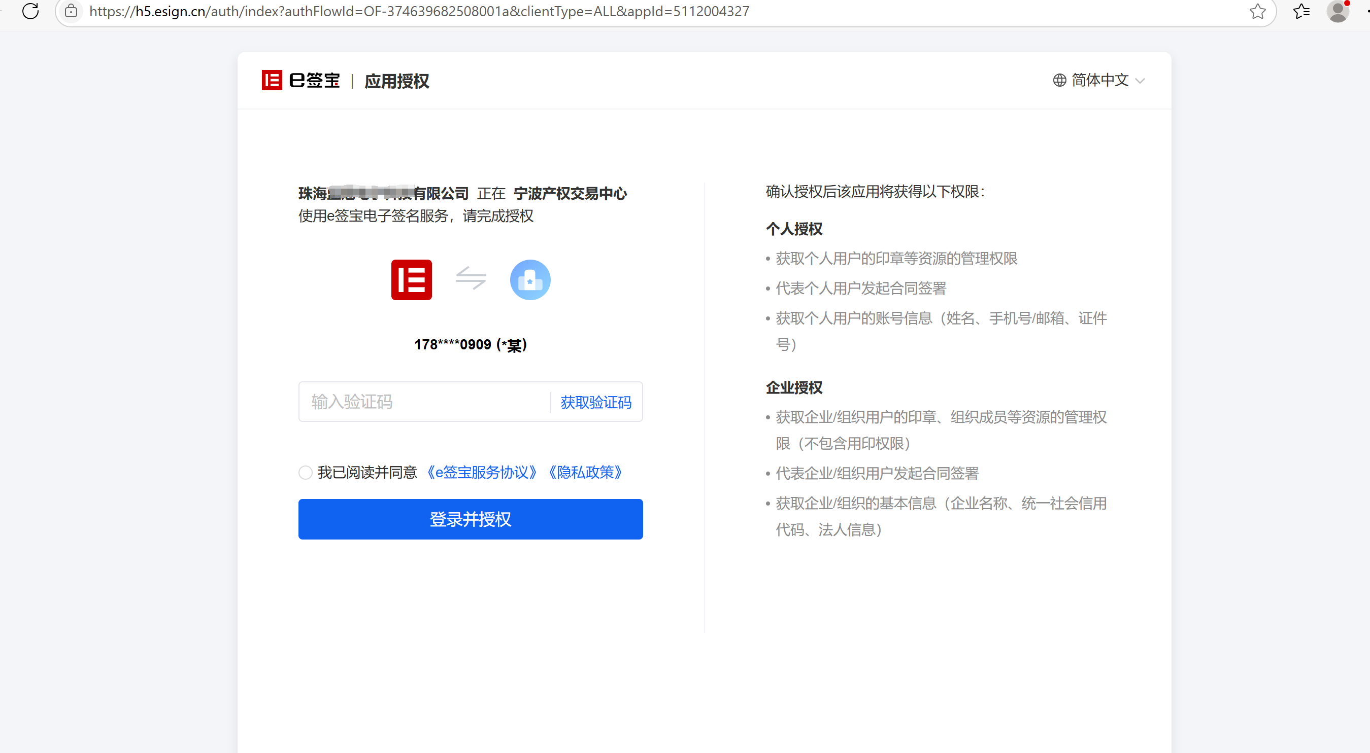 进入企业实名认证页后,需要进行应用授权,获取并输入验证码后,勾选阅读并同意,点击登录并授权提交。