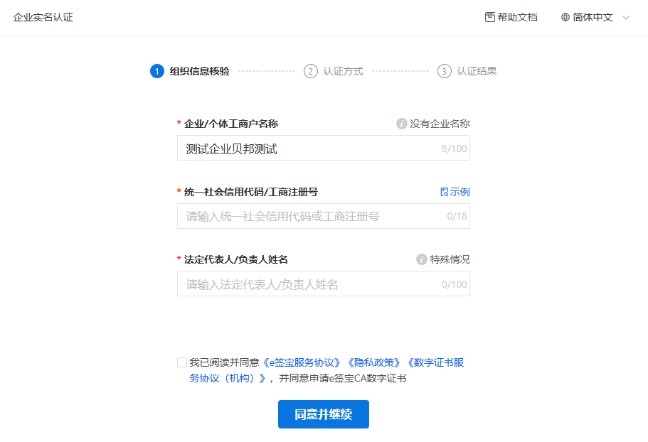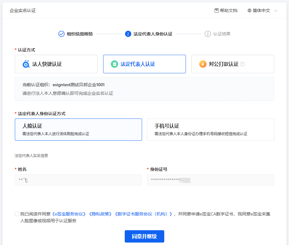进入组织信息校验页面,系统默认自动带出创建时的企业名称,按照营业执照上的信息,补充统一社会信用代码/工商注册号、法定代表人/负责人姓名信息,企业信息填写后,点击【同意并继续】,跳转到认证方式选择页面。