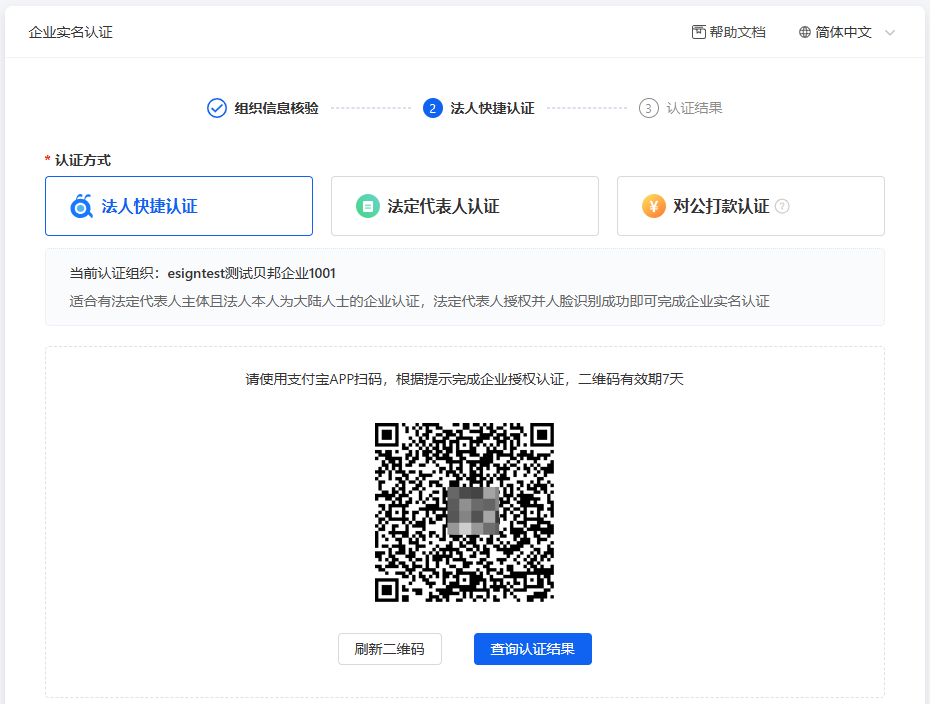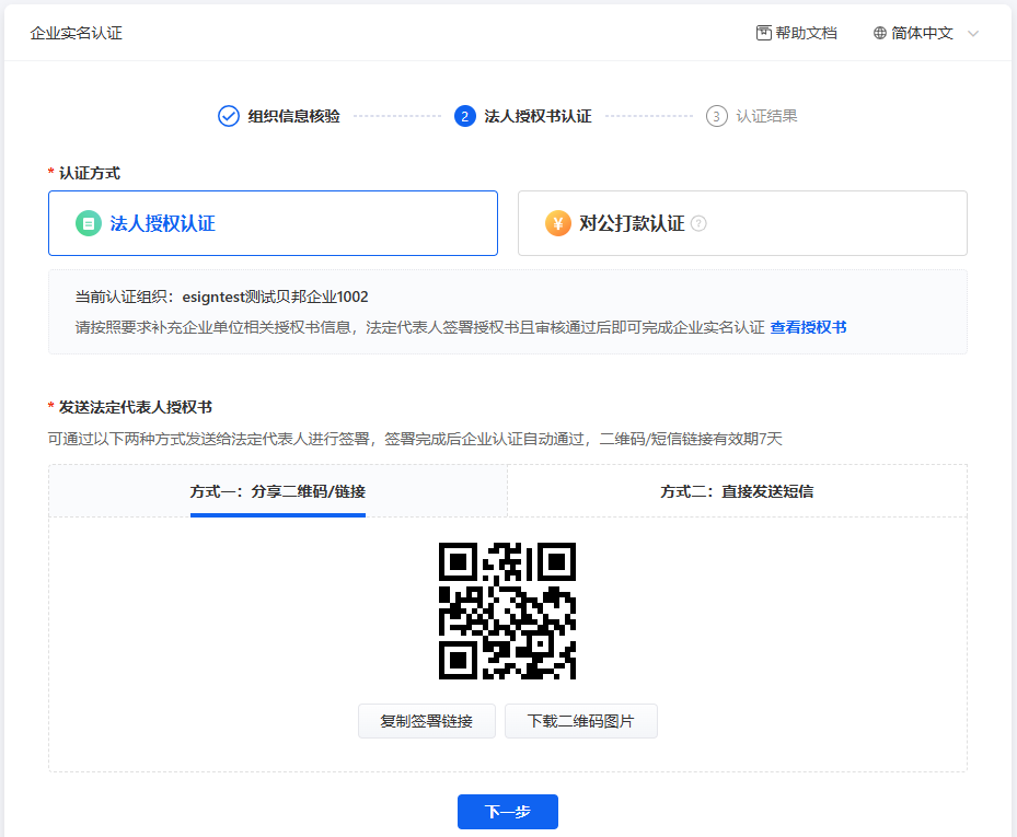 可以选择分享二维码或发送短信给法定代表人,法人完成后企业认证自动通过。