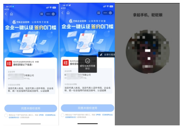 支付宝小程序中点击【同意并授权使用】后,法人完成扫脸,扫脸成功后完成企业实名认证。