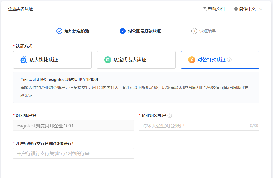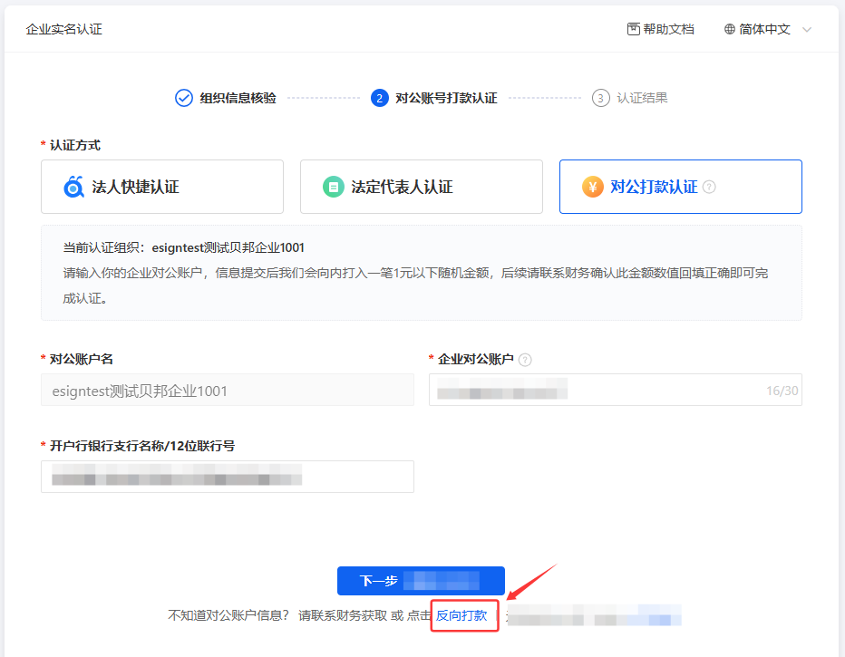 正向打款:e签宝给贵司对公账户上打款1元以下的随机金额。