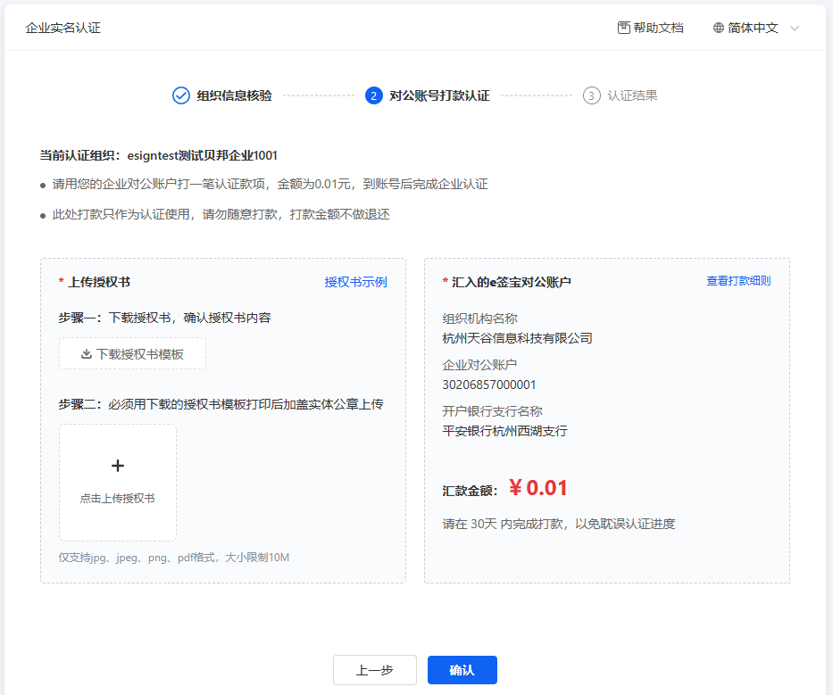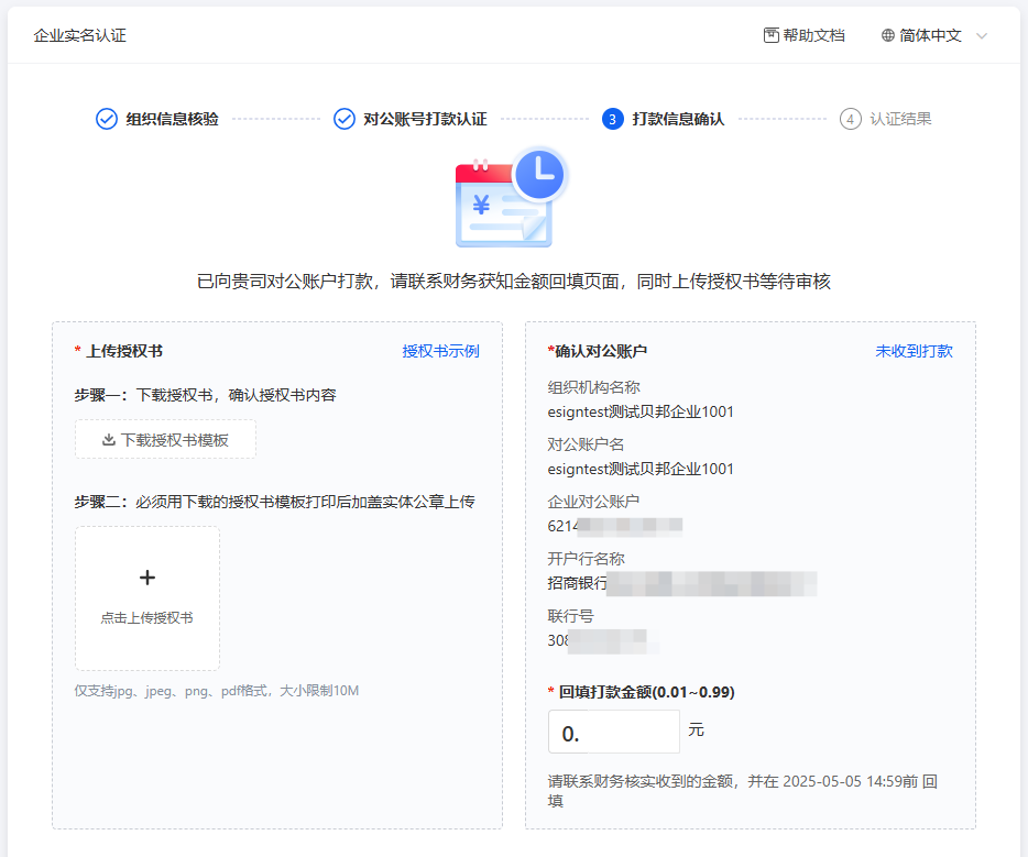 (2)给e签宝对公账户打款0.01元。