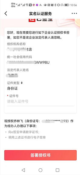 授权书认证默认显示二维码,可以将该二维码提供给法人,法人通过扫码完成签署即可;如果经办人在企业信息核验页面没有录入法人证件号,法人扫码后需要法人补充法人证件号后再去签署授权书。