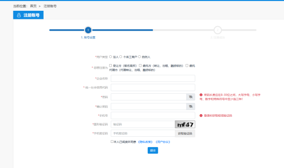 输入密码及确认密码、图形验证码、手机验证码,勾选阅读并同意后提交即可。