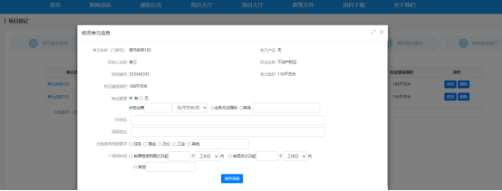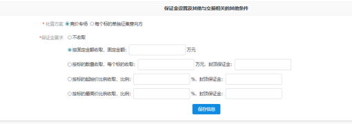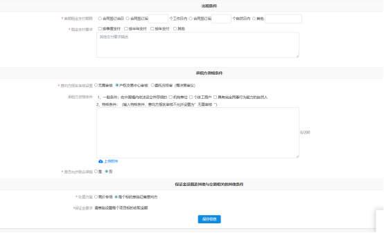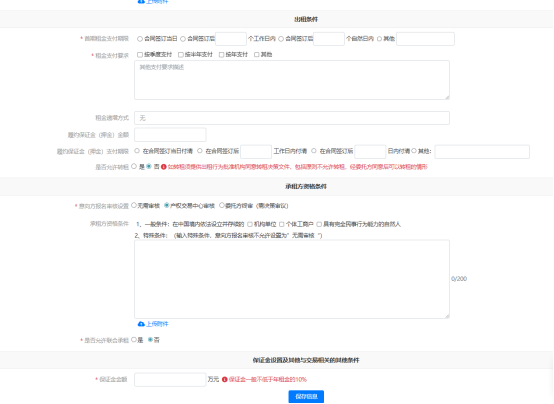 信息披露期及交易方式、出租条件、保证金设置及其他与交易相关的其他条件、承租方资格条件都录入完成后,页面底部点击【保存信息】,进入下一页面。