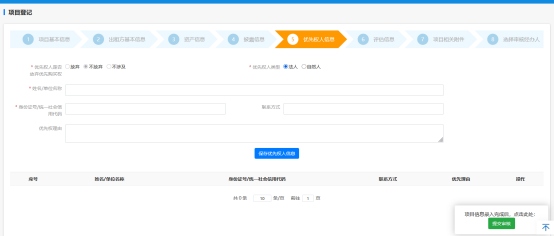 是否涉及优先权:若出租标的涉及优先权,则勾选涉及,否则勾选不涉及。勾选涉及优先权后,在保存项目信息后,操作栏中会有添加优先权人按钮,点击后进入录入优先权人信息页面。