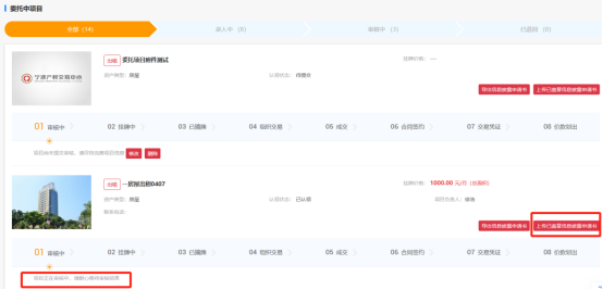 委托中项目列表显示尚未挂牌的委托项目。包括录入中、审核中、已退回的项目,可根据状态进行查询项目,在进度流程图下方可以查看所处状态及提示信息,如下图所示: