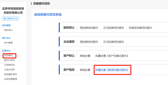 委托方进入用户中心后,点击“项目委托”,选择要委托的项目类型(资产租赁-批量处置《租赁包模式委托》),进入租赁包登记界面,如下图所示: