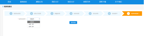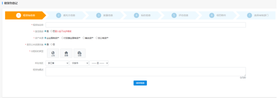 (1)租赁包信息页面:选择出租标的类型,按要求填写出租项目基本信息(带*号的是必填项),填写完成后点击【保存信息】,点击②委托方基本信息进入委托方基本信息录入页面。