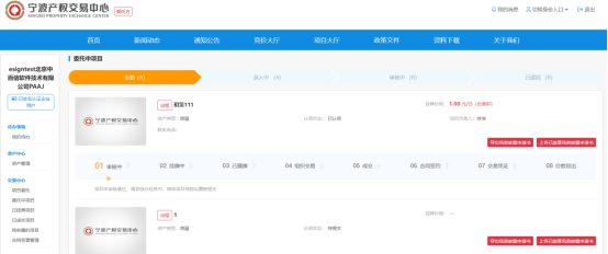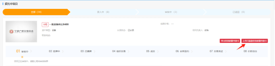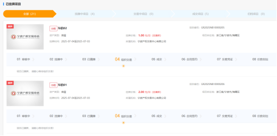 可根据状态查询项目,包括挂牌中、交易中、成交、归档、全部项目。在进度流程图下方可以查看所处状态及提示信息,如下图所示: